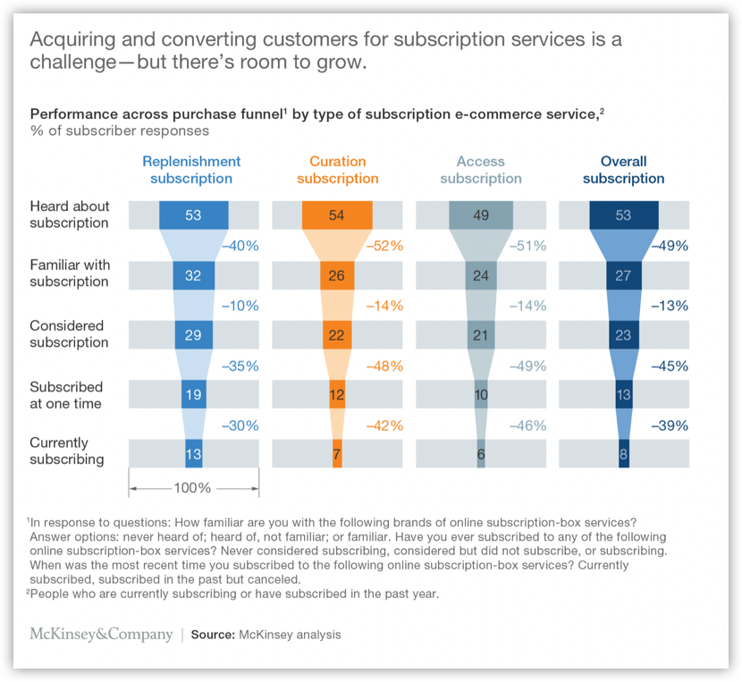 According to McKinsey, subscription e-commerce consumers can be sticky once they find a service they like. Replenishment services are particularly successful with high long-term subscription rates; 45 percent of members have subscribed for at least one year, compared to 35% for curation or access services.
